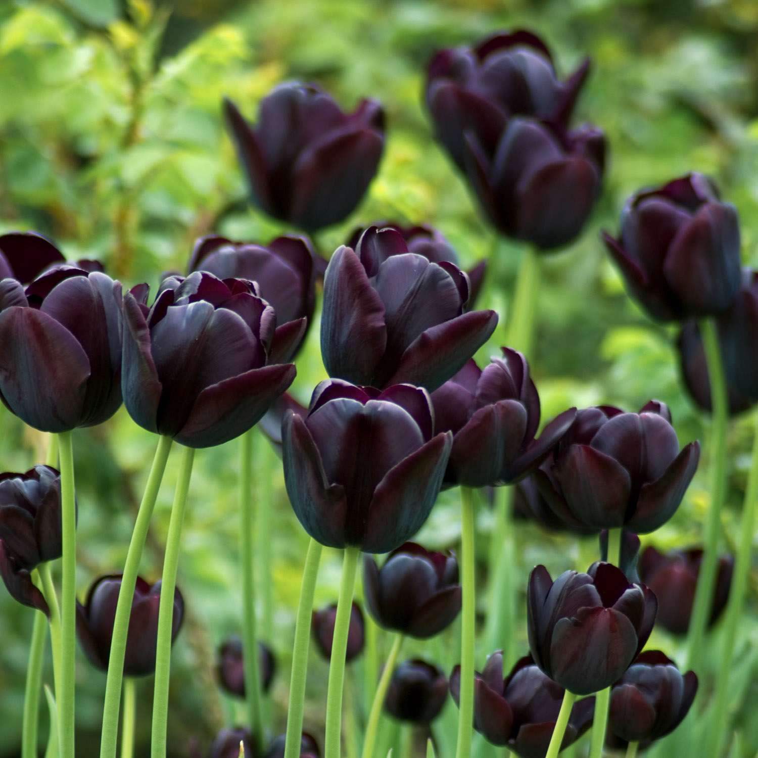 Tulip 'Queen of Night' is a true icon in the spring garden, celebrated for its deep, almost black colour and elegant simplicity. It blooms in May with slender, classically shaped flowers in a dark burgundy to plum tone that, in certain light, appears almost velvet-black. The lightly glossy surface catches the light and adds a sense of depth and calm to the bloom.